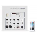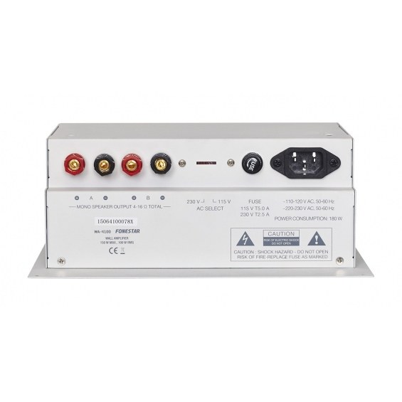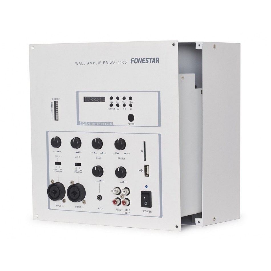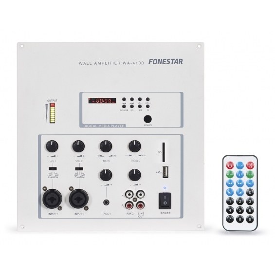 Amplificador de pared 100 W RMS. Entradas de micrófono línea y reproductor USB/SD/MP3 integrados. Caja para montaje en superficie o empotrar. Especialmente diseñado para sonorizaciones en gimnasios aulas polideportivos etc. CARACTERÍSTICAS Amplificador de pared para montaje en superficie o empotrado. Caja de superficie que facilita la instalación y el conexionado. Circuito amplificador clase D. Fuente de alimentación conmutada. Reproductor USB/SD de ficheros MP3. Mando a distancia para reproductor MP3. Interruptor con llave. POTENCIA 150 W máximo 100 W RMS RESPUESTA Micrófonos: 80-15.000 Hz Aux: 45-18.000Hz DISTORSIÓN Armónica: < 1% a 1 kHz ENTRADAS 2 micros/líneas balanceadas combo (XLR y jack 6'3 mm) 600 ? 3 mV y 47.000 ? 100 mV conmutables 1 auxiliar estéreo jack 3'5 mm 47.000 ? 300 mV 1 auxiliar estéreo 2 x RCA 47.000 ? 300 mV SALIDAS 1 line out 2 x RCA 1 V FUNCIONES Reproductor USB/SD/MP3 para memorias hasta 16 GB Indicadores luminosos del nivel de señal de salida CONTROLES Tonos Graves: ±10 dB a 100 Hz Agudos: ±10 dB a 10.000 Hz Volumen: entradas 1 y 2 aux 1 y 2 y reproductor USB/SD/MP3 PHANTOM 15 V IMPEDANCIA 4 a 16 ? 2 salidas en paralelo terminales roscados y bananas ALIMENTACIÓN 230/115 V CA 180 W máximo MEDIDAS Totales: 237 x 239 x 102 mm fondo Encastre: 215 x 182 x 91 mm fondo PESO 3'4 kg