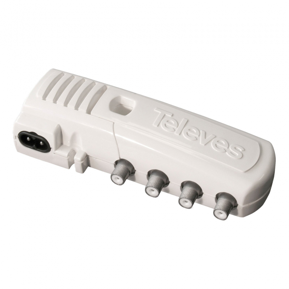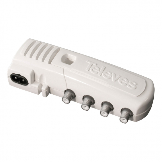 Amplificador de vivienda de 3 salidas (2 TV), para ampliar la red doméstica de televisión. Amplifica la banda de terrestre, con paso del canal de retorno pasivo para permitir la comunicación del módem de abonado con el operador. La salida TV ofrece una ganancia más baja para ser conectada directamente al televisor (sin instalar una toma).