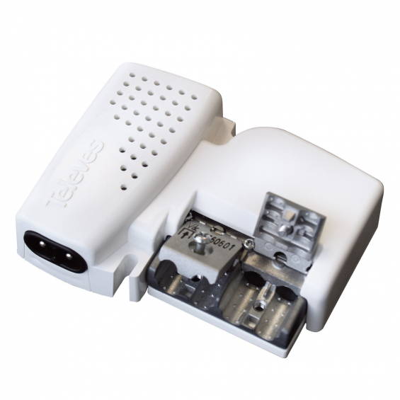 Amplificador de vivienda de 2 salidas con regulación automática de ganancia en terrestre, para ampliar la red doméstica de televisión terrestre y satélite. Incorpora alimentación por la entrada para preamplificadores o un sistema BOSS. Detecta automáticamente en su salida la existencia de una señal de gestión del LNB (tensión y tono) generada por un receptor, y la deja pasar hacia su entrada.