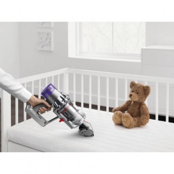 La aspiradora Dyson Cyclone V10 se queda en la base fijada a la pared para recargar y tener los accesorios ordenados. Siempre está lista para limpiar.