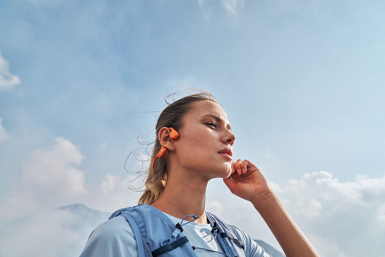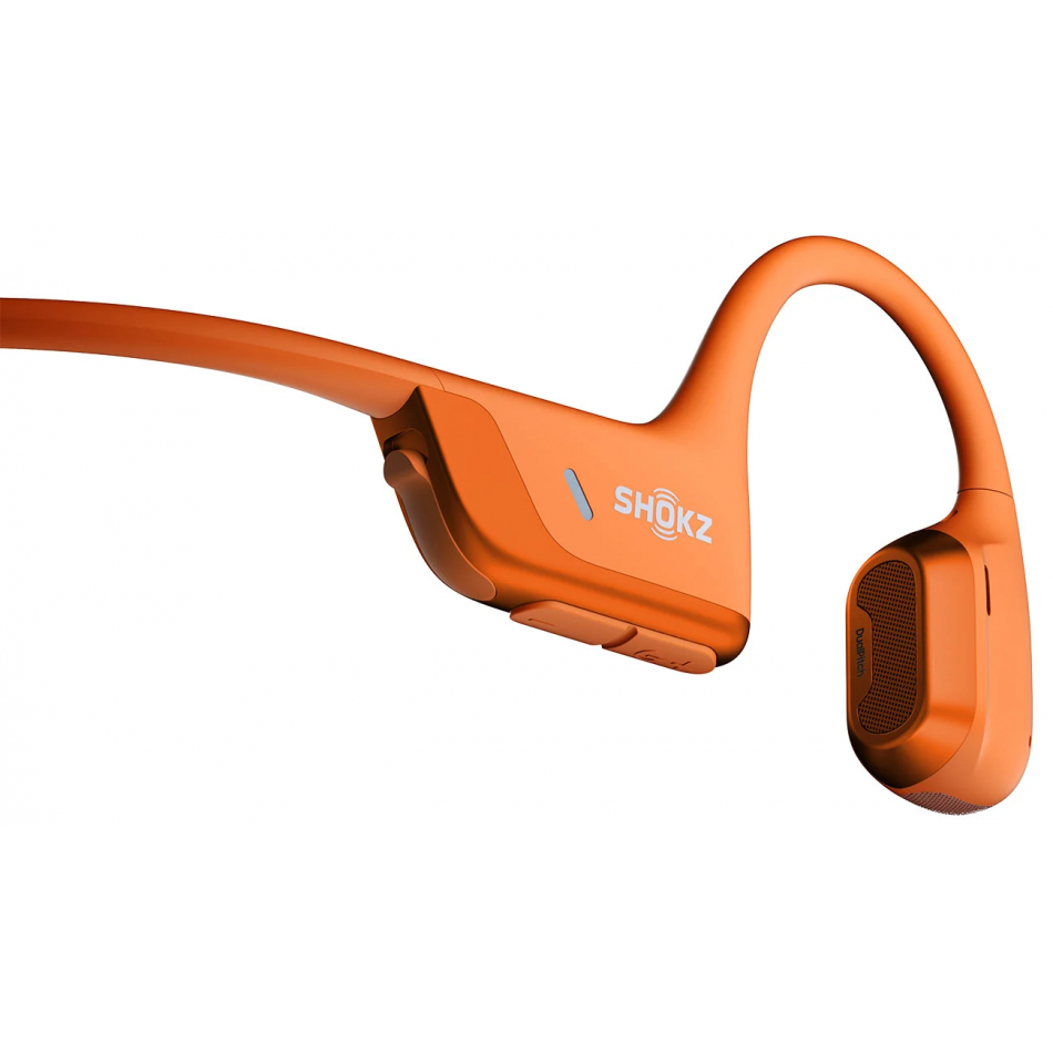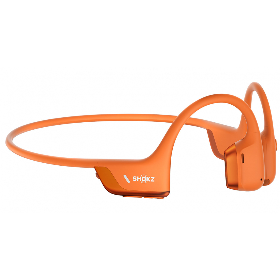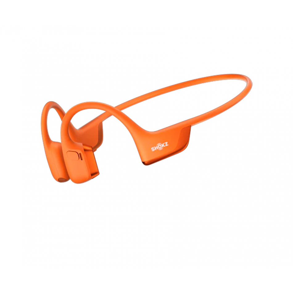 Auriculares de Conducción ósea Inalámbricos SHOKZ OpenRun Pro 2 en color naranja con resistencia IP55, micrófono dual resistente al viento y con cancelación de ruido, conectividad Bluetooth 5.3, emparejamiento multipunto, batería con hasta 12h de autonomía con 1h de carga, conector USB-C para la carga