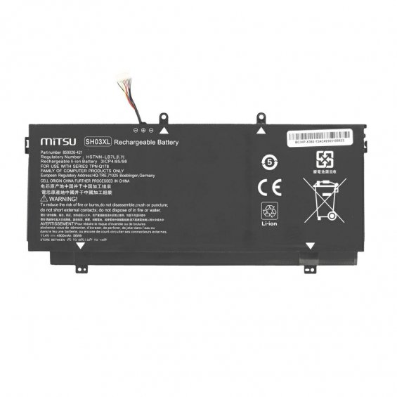 IMPORTANTE: COMPRUEBE QUE EL VOLTAJE DE SU BATERÍA ES EL INDICADO. (10,8 = 11,1 Y 14.4=14,8) IMPORTANTE: HAY DOS VERSIONES DE ESTA BATERÍA. ESTE MODELO TIENE 16 PIN EL CONECTOR Especificaciones: Voltaje: 11.4V Capacidad: 4900 mAh (56 Wh) Celdas: 3 Marca: Mitsu Fabricante de las celdas: Tianneng Código original Mitsu: BT/HP-X360-13AC Seguridad: sobretensión, sobrecalentamiento, cortocircuito, sobrecorriente, sobredescarga y sobrecarga Certificados: CE, RoHS Garantía: 12 meses (capacidad de la batería), 24 meses (Electrónica) Células de marca duraderas y espaciosas. La batería está equipada con celdas de polímero de litio de clase A de la conocida marca Tianneng. Esto nos da la certeza de la capacidad que declaramos de 4900 mAh (56 Wh). Utilizamos componentes de alta calidad para nuestras baterías Mitsu, lo que las hace muy eficientes y duraderas. Su portátil funcionará de manera segura y confiable con esta batería. Esto se debe a una caída mucho más lenta de la capacidad nominal en comparación con otras alternativas más económicas. Seguridad y sin efecto memoria La batería Mitsu está equipada con un sistema de seguridad inteligente que la protege contra sobretensiones, sobrecalentamientos, así como cortocircuitos y sobrecargas de corriente. También puedes cargar esta batería de forma segura cuando quieras y durante el tiempo que quieras, ya que no tiene efecto memoria. Rendimiento de la batería y vida útil La batería Mitsu es muy poco propensa a autodescargarse. Esto significa que podemos ofrecerle la garantía de que más del 70% de la capacidad de la batería se mantendrá después de un año de uso. A la hora de cuidar la batería, ésta debe durar un periodo de unos 3 años. Protección del medio ambiente La producción de nuestras baterías se realiza en cada etapa cuidando el medio ambiente, lo que está garantizado por los certificados CE, RoHS e ISO9001. Modelos compatibles: HP Envy 13-AB Series HP Spectre x360 13-AC Series HP Spectre X360 13-W Series HP Spectre X360 13T-AC Series HP Spectre X360 13T-W Series Partnumber compatibles: 3ICP4/85/98 71025 859026-421 HQ-TRE HSTNN-LB7L SH03-3S1P SH03XL TPN-Q178