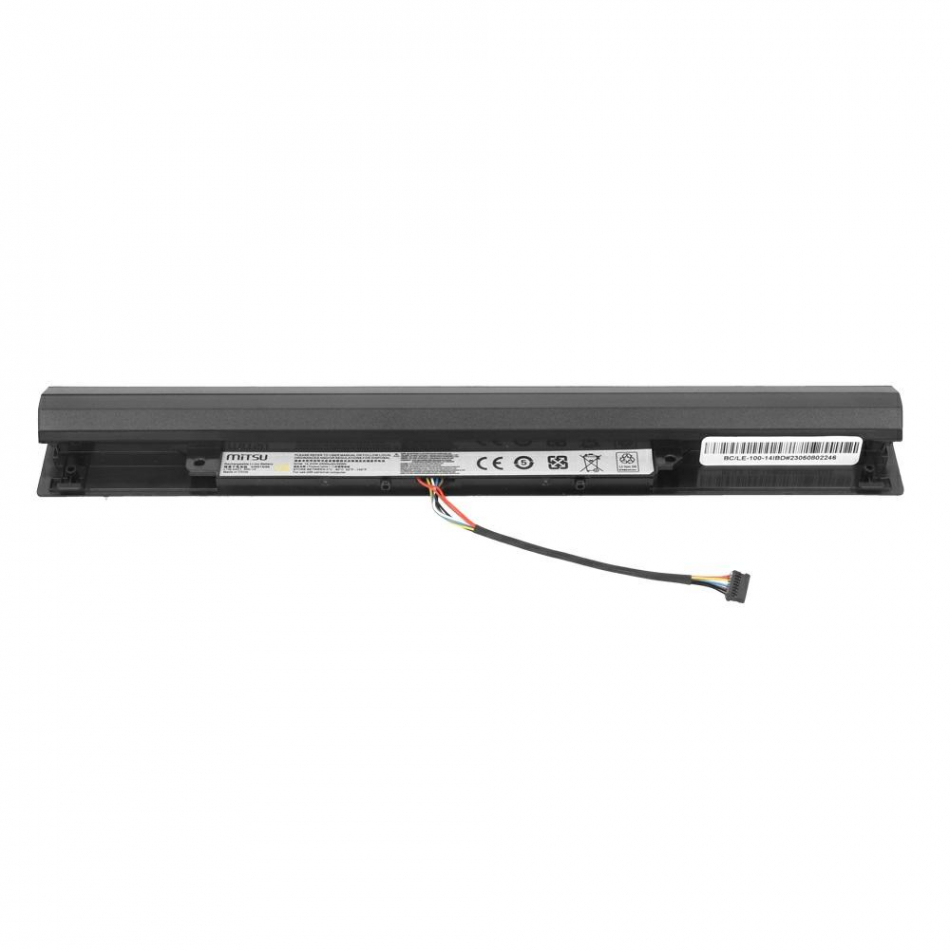 IMPORTANTE: COMPRUEBE QUE EL VOLTAJE DE SU BATERÍA ES EL INDICADO. (10,8 = 11,1 Y 14.4=14,8) Especificaciones: Voltaje: 14.4V Capacidad: 2200 mAh (32 Wh) Celdas: 4 Marca: Mitsu Fabricante de las celdas: Tianneng Código original Mitsu: BC/LE-100-14IBD Seguridad: sobretensión, sobrecalentamiento, cortocircuito, sobrecorriente, sobredescarga y sobrecarga Certificados: CE, RoHS Garantía: 12 meses (capacidad de la batería), 24 meses (Electrónica) Células de marca duraderas y espaciosas. La batería está equipada con celdas de polímero de litio de clase A de la conocida marca Tianneng. Esto nos da la certeza de la capacidad que declaramos de 2200 mAh (32 Wh). Utilizamos componentes de alta calidad para nuestras baterías Mitsu, lo que las hace muy eficientes y duraderas. Su portátil funcionará de manera segura y confiable con esta batería. Esto se debe a una caída mucho más lenta de la capacidad nominal en comparación con otras alternativas más económicas. Seguridad y sin efecto memoria La batería Mitsu está equipada con un sistema de seguridad inteligente que la protege contra sobretensiones, sobrecalentamientos, así como cortocircuitos y sobrecargas de corriente. También puedes cargar esta batería de forma segura cuando quieras y durante el tiempo que quieras, ya que no tiene efecto memoria. Rendimiento de la batería y vida útil La batería Mitsu es muy poco propensa a autodescargarse. Esto significa que podemos ofrecerle la garantía de que más del 70% de la capacidad de la batería se mantendrá después de un año de uso. A la hora de cuidar la batería, ésta debe durar un periodo de unos 3 años. Protección del medio ambiente La producción de nuestras baterías se realiza en cada etapa cuidando el medio ambiente, lo que está garantizado por los certificados CE, RoHS e ISO9001. Modelos compatibles: Lenovo IdeaPad 100 80QQ Lenovo IdeaPad 100-14 Lenovo IdeaPad 100-14IBD Lenovo IdeaPad 100-15IBD Lenovo IdeaPad V4400 Lenovo Ideapad B50-50 Series Lenovo IdeaPad 100-15IBD 80QQ Lenovo IdeaPad 300-15ISK 80Q7 Lenovo IdeaPad 300-15IBR 80M3 Lenovo IdeaPad 110-15ISK Series Part Number Compatibles: L15L4A01 L15M4A01 L15S4A01 L15S4E01 L15M4E01 5B10K02215 35042010 35042799 35049554 35046325 35048355 35041898 35045891 5B10H71978 5B10L12769 5B10H70339 5B10K02219 5B10L12770 5B10H70341 5B10K02218 35045481 Nota: Esta batería puede ser compatible con otros modelos no indicados en nuestra lista
