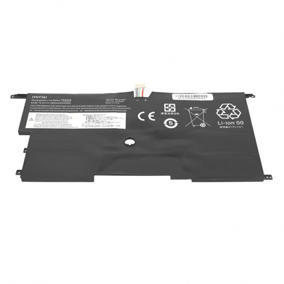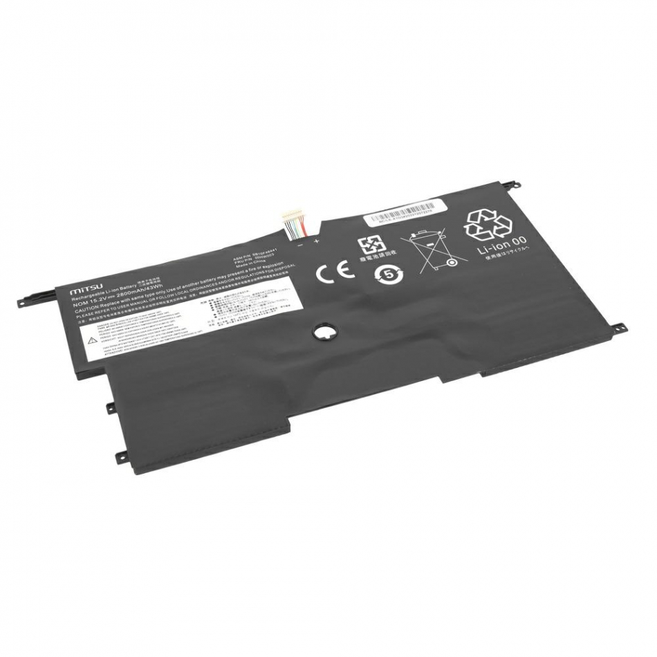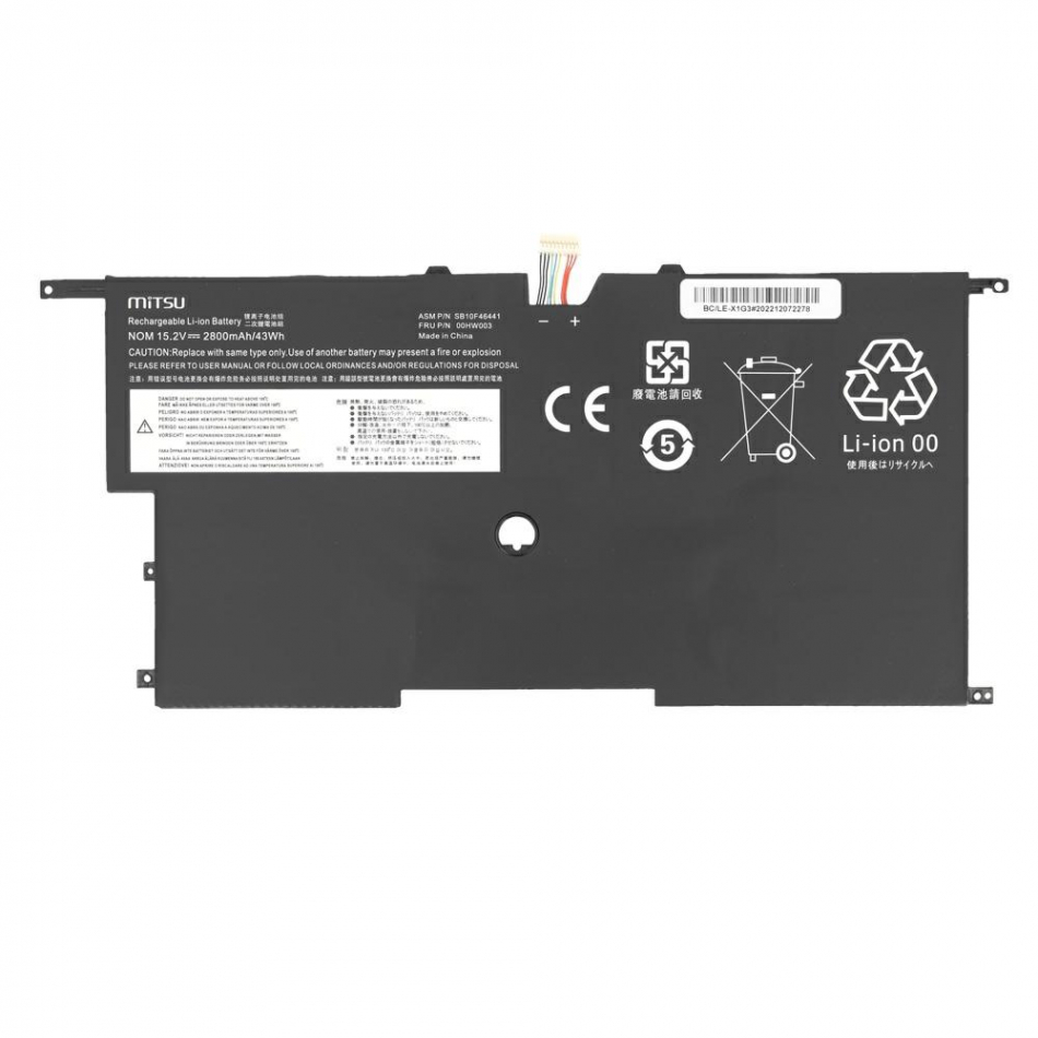 IMPORTANTE: COMPRUEBE QUE EL VOLTAJE DE SU BATERÍA ES EL INDICADO. (10,8 = 11,1 Y 14.4=14,8) Especificaciones: Voltaje: 15.2V Capacidad: 2800 mAh (43h) Celdas: 4 Marca: Mitsu Fabricante de las celdas: Tianneng Código original Mitsu: BC/LE-X1G3 Seguridad: sobretensión, sobrecalentamiento, cortocircuito, sobrecorriente, sobredescarga y sobrecarga Certificados: CE, RoHS Garantía: 12 meses (capacidad de la batería), 24 meses (Electrónica) Células de marca duraderas y espaciosas. La batería está equipada con celdas de polímero de litio de clase A de la conocida marca Tianneng. Esto nos da la certeza de la capacidad que declaramos de 2800 mAh (43 Wh). Utilizamos componentes de alta calidad para nuestras baterías Mitsu, lo que las hace muy eficientes y duraderas. Su portátil funcionará de manera segura y confiable con esta batería. Esto se debe a una caída mucho más lenta de la capacidad nominal en comparación con otras alternativas más económicas. Seguridad y sin efecto memoria La batería Mitsu está equipada con un sistema de seguridad inteligente que la protege contra sobretensiones, sobrecalentamientos, así como cortocircuitos y sobrecargas de corriente. También puedes cargar esta batería de forma segura cuando quieras y durante el tiempo que quieras, ya que no tiene efecto memoria. Rendimiento de la batería y vida útil La batería Mitsu es muy poco propensa a autodescargarse. Esto significa que podemos ofrecerle la garantía de que más del 70% de la capacidad de la batería se mantendrá después de un año de uso. A la hora de cuidar la batería, ésta debe durar un periodo de unos 3 años. Protección del medio ambiente La producción de nuestras baterías se realiza en cada etapa cuidando el medio ambiente, lo que está garantizado por los certificados CE, RoHS e ISO9001.   Modelos compatibles: Lenovo Thinkpad Carbon X1 Gen 2 Series Lenovo Thinkpad Carbon X1 Gen 3 Series Part number compatibles: 00HW002 00HW003 45N1700 45N1701 45N1702 45N1703 4ICP5/58/73-2 SB10F46440 SB10F46441 Nota: Esta batería puede ser compatible con otros modelos no indicados en nuestra lista