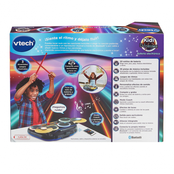 ¡Despierta la pasión musical con la Kidi DJ Drums de VTech ! Esta batería electrónica completa combina aprendizaje, creatividad y diversión para niños y adolescentes. Con pantalla LCD interactiva, Bluetooth, efectos de luces y platillos iluminados , transforma cualquier espacio en un escenario vibrante. Incluye modo profesor, juegos para mejorar el oído musical y la posibilidad de crear, mezclar y grabar ritmos únicos. Perfecta para fomentar el desarrollo musical en un entorno seguro y divertido.