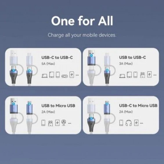 Diseño 4 en 1: carga y sincroniza todos tus dispositivos con un solo cable. Este cable incluye USB-A, USB-C, Micro USB y un adaptador exclusivo de USB-C a Micro USB, lo que lo hace compatible con una amplia gama de dispositivos, desde teléfonos inteligentes y tabletas hasta computadoras portátiles y bancos de energía.