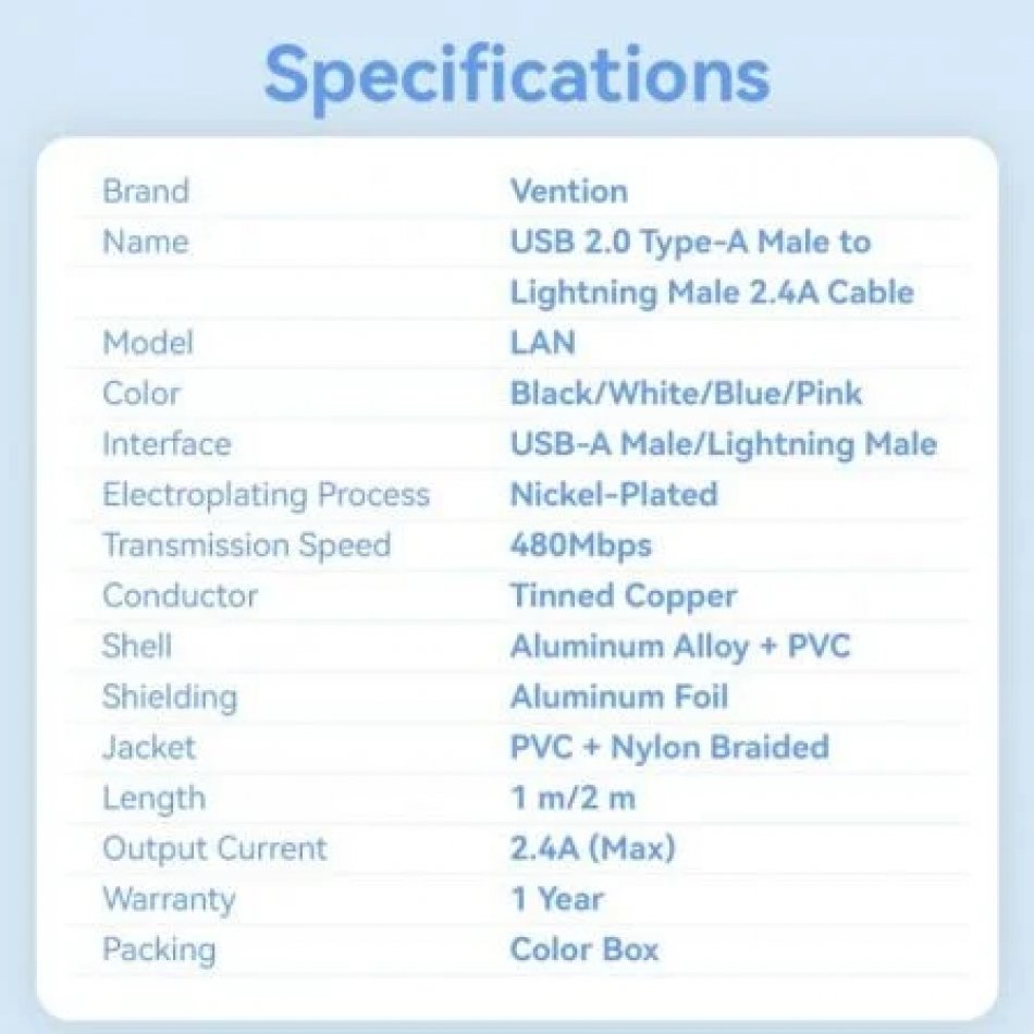 Cable USB Lightning Vention LANWH/ USB Macho - Lightning Macho/ 480Mbps/ 2m/ Blanco