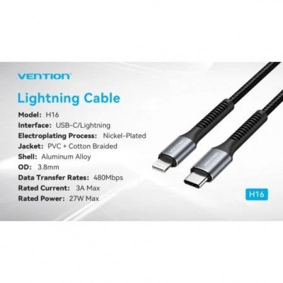 Cable USB Tipo-C Lightning Vention H16BF/ Lightning Macho - USB Tipo-C Macho/ 27W/ 480Mbps/ 1m/ Negro
