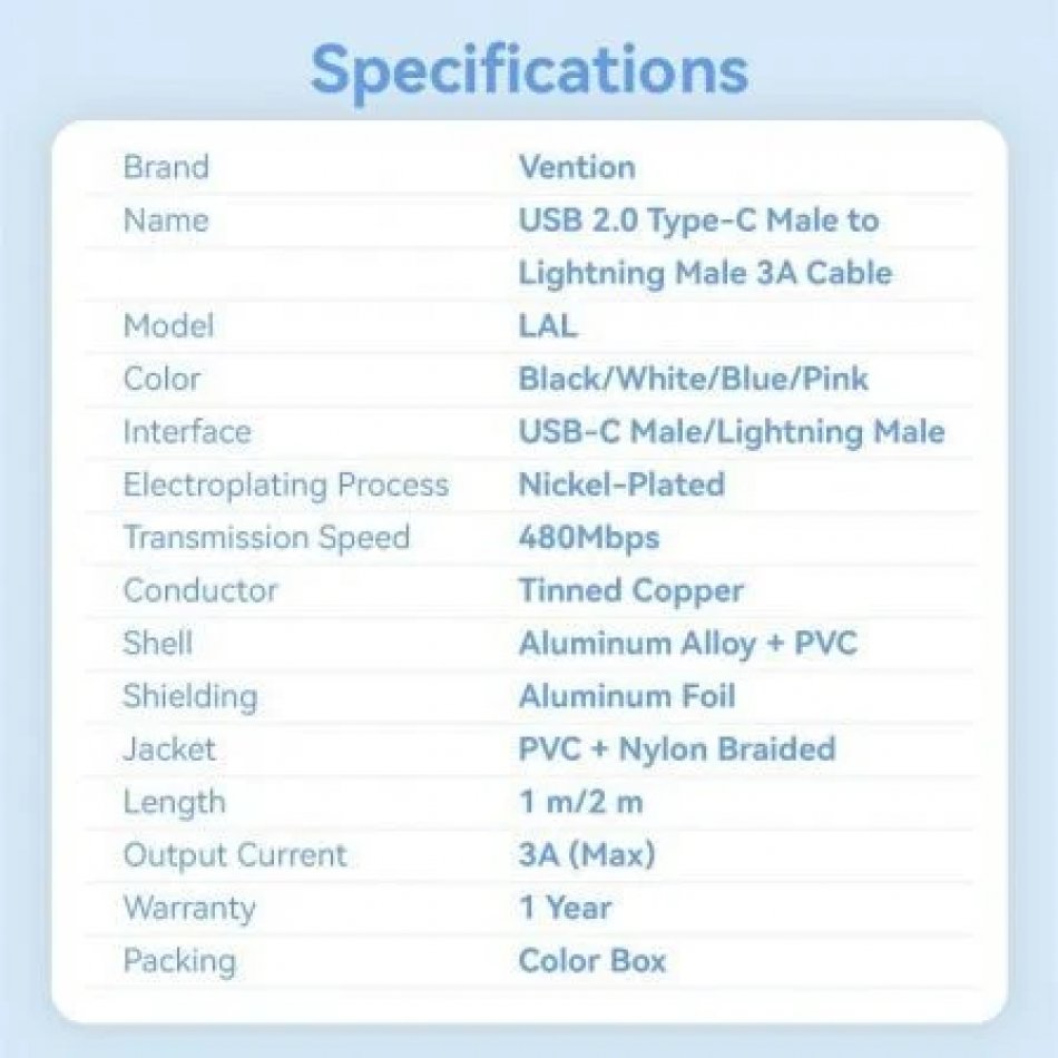 Cable USB Tipo-C Lightning Vention LALBF/ USB Tipo-C Macho - Lightning Macho/ 27W/ 480Mbps/ 1m/ Negro