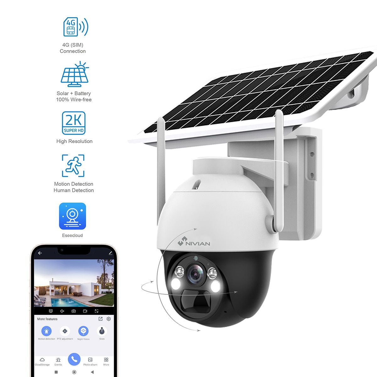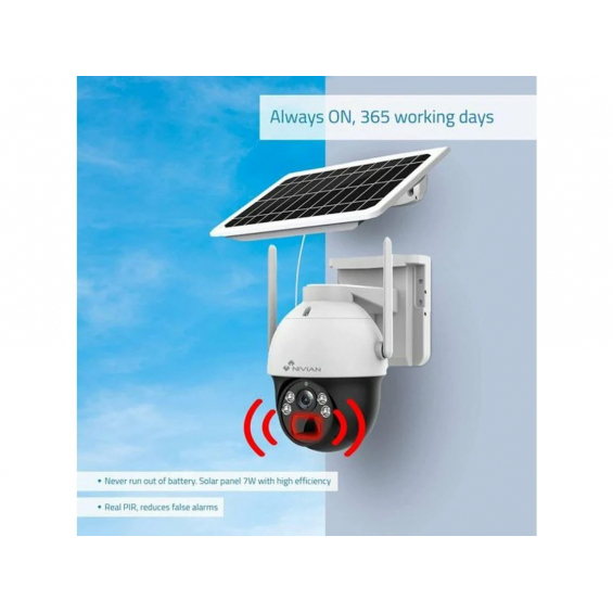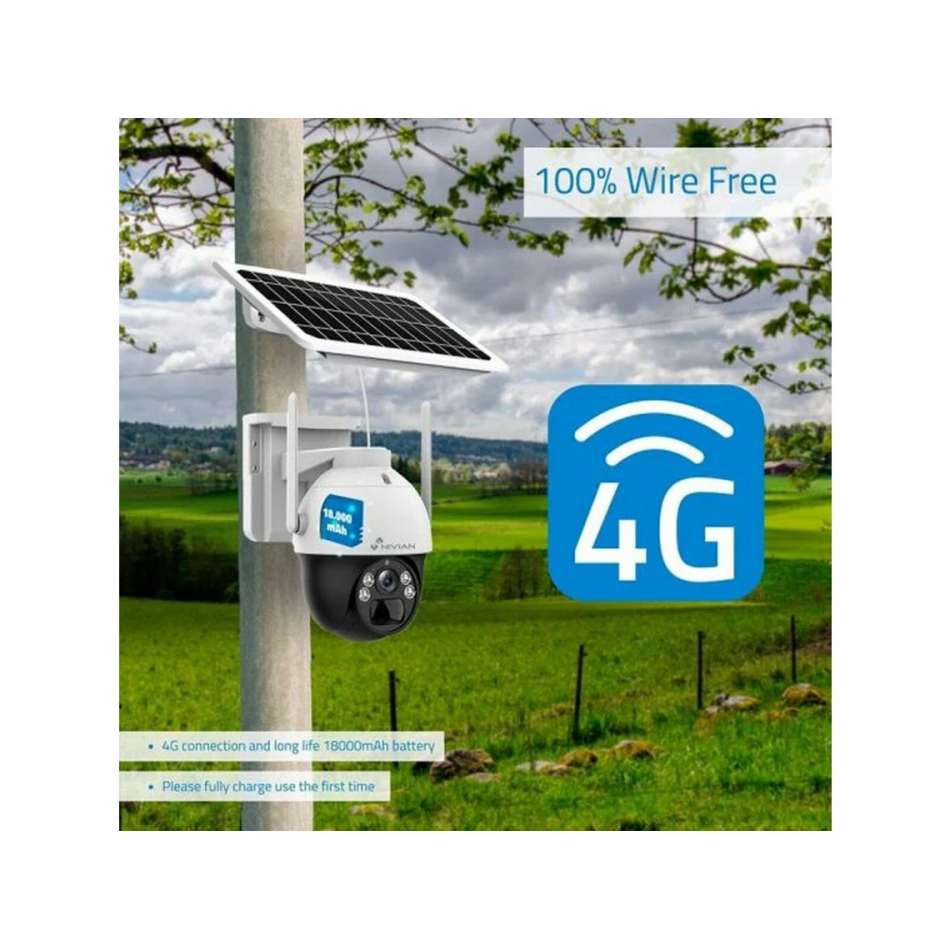 Camara IP PT Motorizada 2,8mm 2K 4G LTE Bateria NIVIAN – Seguridad autónoma con panel solar y detección inteligente