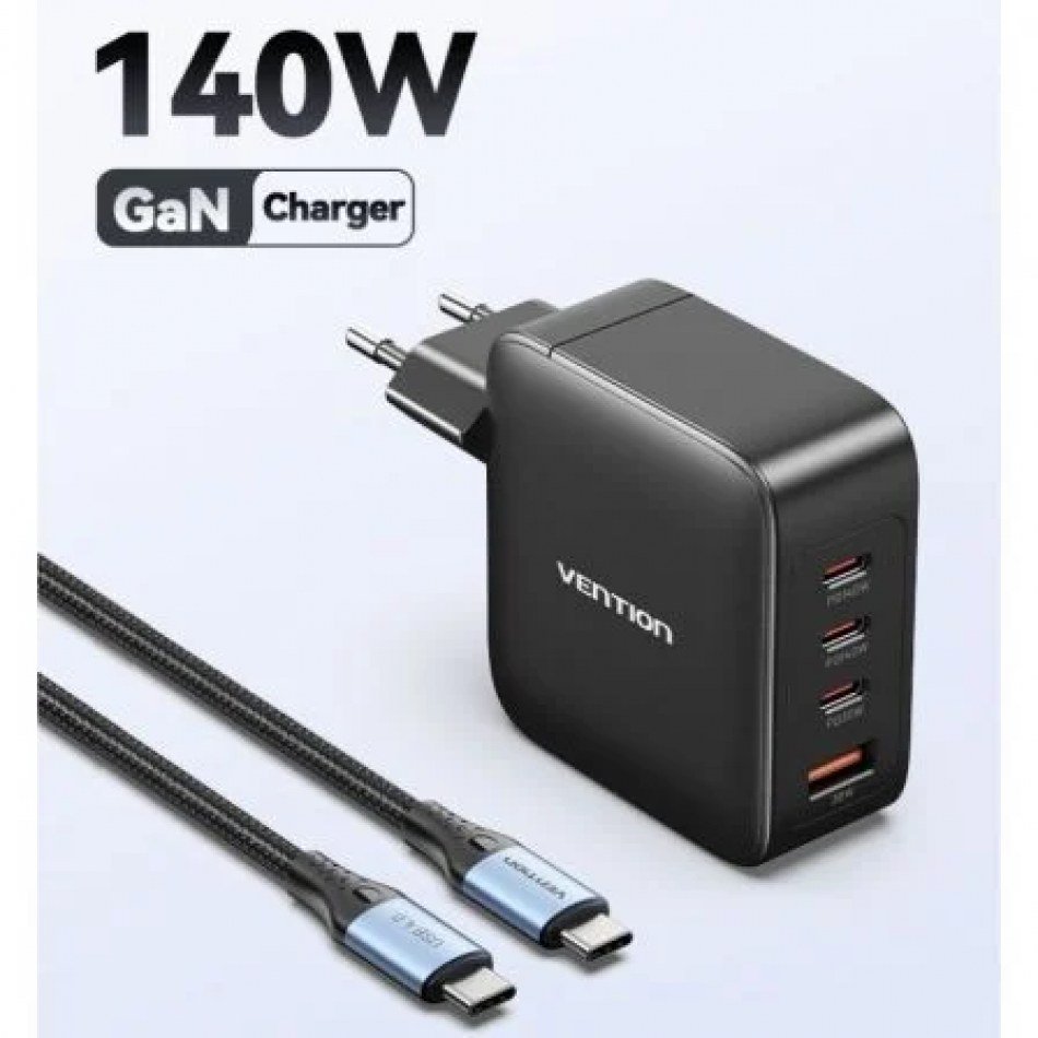Cargador Gan de Pared Vention FEIB0-EU/ 3xUSB Tipo-C + Cable USB Tipo-C/ 1xUSB/ 140W