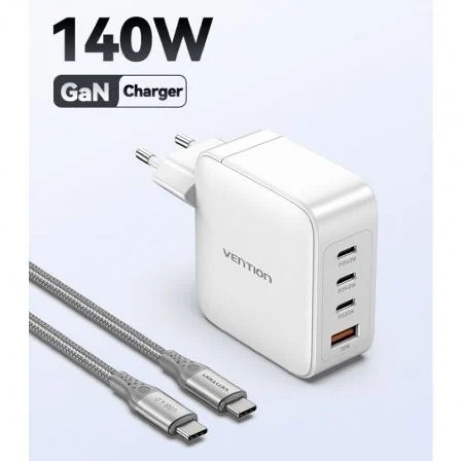 Cargador Gan de Pared Vention FEIW0-EU/ 3xUSB Tipo-C + Cable USB Tipo-C/ 1xUSB/ 140W