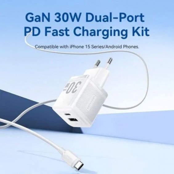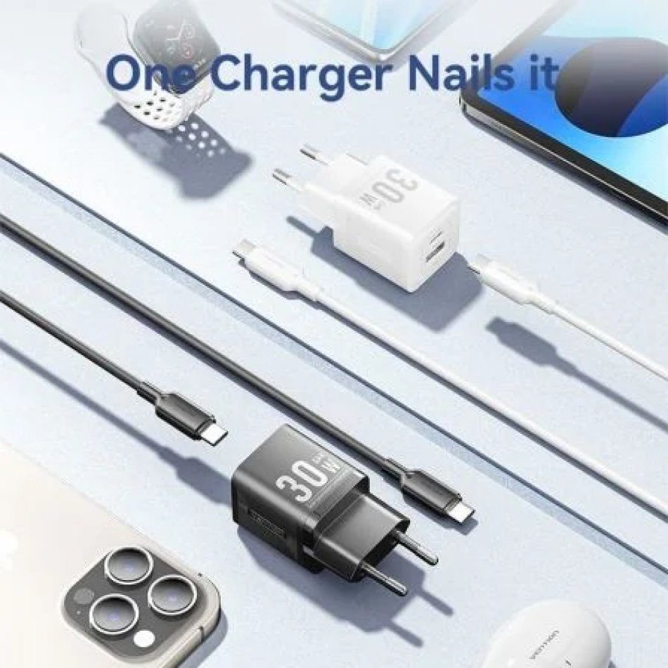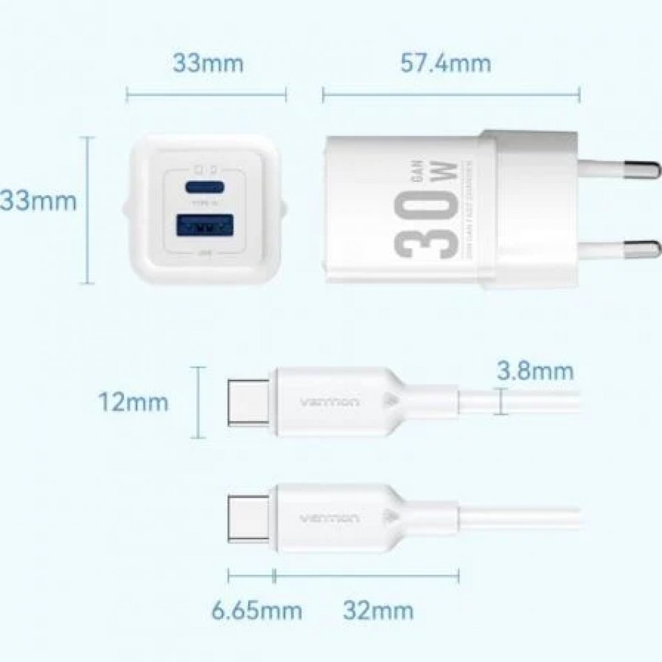 Cargador Gan de Pared Vention TZ-FEQW0-EU-01/ 1xUSB Tipo-C/ 1xUSB + Cable USB Tipo-C/ 30W