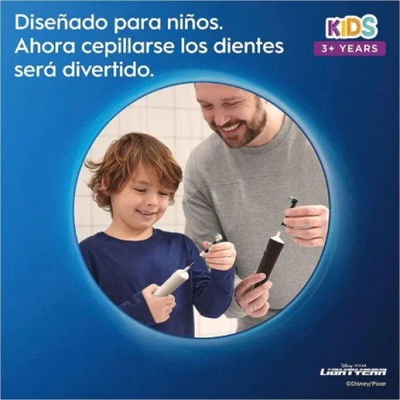 El cepillo eléctrico de Oral-B Kids para niños mayores de 3 años combina la diversión de Lightyear con la limpieza suave y eficaz de un cepillo de dientes Oral-B recomendado por dentistas. Con 2 modos de cepillado que incluyen un modo sensible único para niños, este cepillo limpia los dientes con suavidad. Elimina más placa que un cepillo de dientes manual normal. Incluye 4 pegatinas temáticas de Lightyear para personalizar el mango.