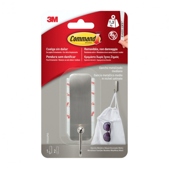 Organiza tu espacio con estilo gracias al gancho mediano Command™ en elegante acabado níquel pulido. Ideal para colgar bolsos, llaves, toallas, accesorios de cocina o baño y mucho más, sin necesidad de herramientas ni perforaciones. Gracias a la tecnología Command™, se adhiere de forma segura a múltiples superficies como paredes pintadas, madera, azulejos, vidrio y más. Se instala fácilmente y se retira sin dejar agujeros, marcas ni residuos, lo que lo convierte en una solución práctica y discreta para cualquier ambiente. Características: -ORGANIZA SIN DAÑAR: di adiós a agujeros, marcas o residuos pegajosos en las paredes, puertas, armarios o alacenas -Soporta hasta 1.3kg (3 lb) de peso. -Incluye 1 gancho reutilizable y 2 tiras adhesivas resistentes Dimensiones: -Anchura total (sistema métrico): 25 mm -Longitud total: 32 mm -Longitud total (sistema métrico): 96 mm