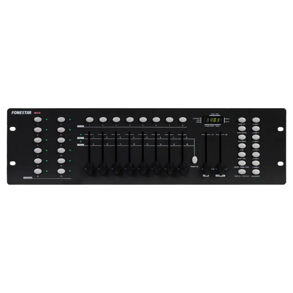 El Fonestar DMX-83 es un controlador DMX 512 de 192 canales , diseñado para gestionar sistemas de iluminación de manera eficiente en eventos, escenarios y locales. Algunas de sus características incluyen: