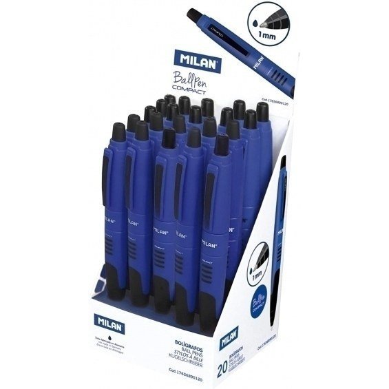Milan Compact Expositor de 20 Boligrafos de Bola Retractiles - Punta Redonda 1mm - Cuerpo Azul/Negro - Color Azul