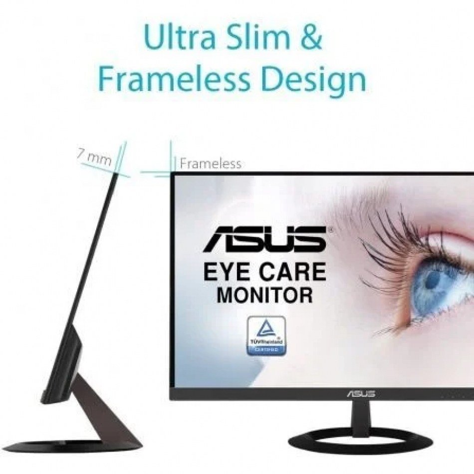 Pensado para ahorrar espacio, el monitor ASUS VZ279HE tiene un perfil que se estrecha hasta los 7 mm. Al no incluir marcos, es ideal para sumergirse en configuraciones de varias pantallas. Su avanzado panel IPS ofrece una sorprendente relación de contraste de 80 000 000:1 y ángulos de visión de 178°. Además, la tecnología ASUS Eye Care proporciona una visualización más cómoda.