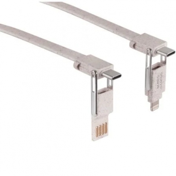 Dos cables bio-sostenibles fabricados con un innovador sustitutivo del plástico: la fibra de trigo. Cable llavero con diseño plegable magnético fácil de transportar y cable XL de 1m. Cable antienredos multiconector USB, carga ultrarrápida 3.1, 50W y transferencia de datos