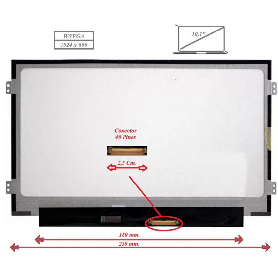 PANTALLA PORTATIL LED 10\" SLIM  Características:Tamaño: 10.1 PulgadasResolución: WSVGA 1024X600Conector: 40 pines Tecnología luz posterior: LED Compatible: LP101WSB (TL)(N1)LTN101NT05N101L6-LODN101L6-LOCN101LGE-L41 Rev.C1B101AW02 V.0B101AW02 V.1N101L6-L0DB101AW06 V.0HSD101PHW3HSD101PFW4LTN101NT08CLAA101NB03A Modelos:Acer Aspire One D255Acer Aspire One D255E Acer Aspire One D260Acer Aspire One D260-13grs Acer Aspire One D270Asus EEEpc 10.1\" Asus Eeepc 1008HAsus Eeepc 1008HASony Vaio VPC-EA Series Sony Vaio VPC-EA3S1E Samsung N143 SeriesSamsung NP-N143 Series  Compruebe que corresponde la imagen con la pantalla que necesite.*** ATENCION ***Porfavor Asegúrese antes de instalar montar pegar etc.. De NO quitar los protectores de plástico que lleva la pantalla. Antes tiene que Pre montarla y probar que la pantalla funciona correctamente ya que Todos Los Táctiles o pantalla LCD o LED deben probarse sobrepuestos. NO se aceptara NINGUN TIPO DE GARANTIA o DEVOLUCION una vez estén las protecciones retiradas, manipuladas o sin ellas.Una vez quitados los protectores se entenderá que la pantalla se ha instalado en el dispositivo y a partir de ese momento no se podrán reclamar daños o defectos. El fabricante solo acepta garantía de la pantalla sin haber sido instalada, debido a que, por su fragilidad durante la instalación se puede romper. Normalmente en el 95% de los casos es por incompatibilidad de la misma , no porque no funcione correctamente.