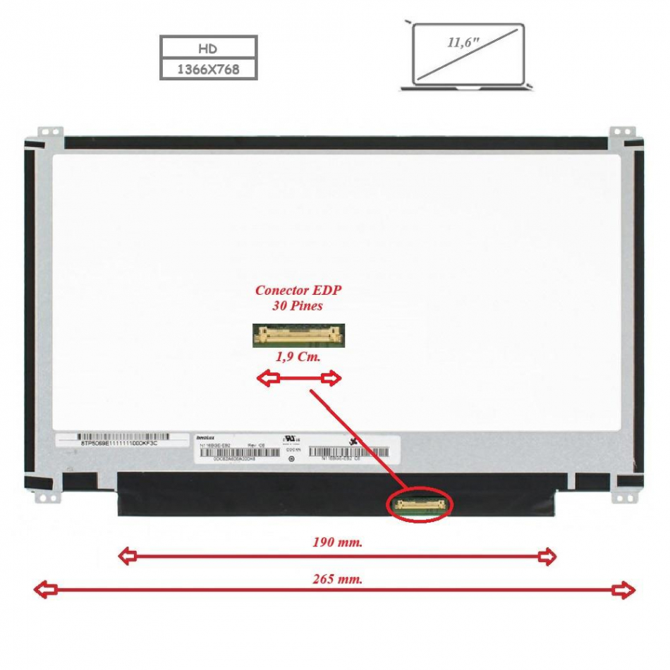 PANTALLA PORTATIL 11.6 LED SLIM EDP 30 PIN / B.SUPERIOR (INFERIOR AL BORDE) / N116BGE-EA2 REV.C1BRACKETS INFERIORES JUNTO AL BORDE DE LA PANTALLA Características:Tamaño: 11.6 PulgadasResolución: WXGA 1366X768Conector: 30 pines Tecnología luz posterior: LED Compatible:N116BGE-EA2 REV.C1N116BGE-EB2B116XTN02.2B116XTN02.3 Compruebe que corresponde la imagen con la pantalla que necesite. *** ATENCION ***Porfavor Asegúrese antes de instalar, montar, pegar, etc.. De NO quitar los protectores de plástico que lleva la pantalla. Antes tiene que Pre montarla y probar que la pantalla funciona correctamente ya que Todos Los Táctiles o pantalla LCD o LED deben probarse sobrepuestos. NO se aceptara NINGUN TIPO DE GARANTIA o DEVOLUCION una vez estén las protecciones retiradas, manipuladas o sin ellas.Una vez quitados los protectores se entenderá que la pantalla se ha instalado en el dispositivo y a partir de ese momento no se podrán reclamar daños o defectos. El fabricante solo acepta garantía de la pantalla sin haber sido instalada, debido a que, por su fragilidad durante la instalación se puede romper. Normalmente en el 95% de los casos es por incompatibilidad de la misma , no porque no funcione correctamente.  [R]ADHPANTA-01[/R]