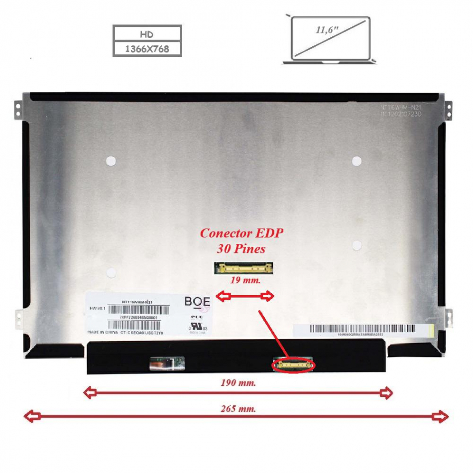 PANTALLA PORTATIL LED 11.6\" SLIM EDP 30 PIN BRACKET LATERAL Características:Tamaño: 11.6 PulgadasResolución: WXGA 1366X768Conector: 30 pines Tecnología luz posterior: LED Compatible:B116XTN02.1B116XTN01.0N116BGE-EA2 REV.C1N116BGE-EA2 REV.C2N116BGE-EA2 REV B2N116BGE-EA2 REV B1N116BGE-EB2NT116WHM-N21NT116WHM-N11N116BGE-E32LTN116AL01-301B116XTN02.5N116BGE-E42B116XTN02.3B116XTN02.3 HW0AM116NWR1NT116WHM-N42N116BCA-EA1 rev.C1  Compruebe que corresponde la imagen con la pantalla que necesite. *** ATENCION ***Porfavor Asegúrese antes de instalar, montar, pegar, etc.. De NO quitar los protectores de plástico que lleva la pantalla. Antes tiene que Pre montarla y probar que la pantalla funciona correctamente ya que Todos Los Táctiles o pantalla LCD o LED deben probarse sobrepuestos. NO se aceptara NINGUN TIPO DE GARANTIA o DEVOLUCION una vez estén las protecciones retiradas, manipuladas o sin ellas.Una vez quitados los protectores se entenderá que la pantalla se ha instalado en el dispositivo y a partir de ese momento no se podrán reclamar daños o defectos. El fabricante solo acepta garantía de la pantalla sin haber sido instalada, debido a que, por su fragilidad durante la instalación se puede romper. Normalmente en el 95% de los casos es por incompatibilidad de la misma , no porque no funcione correctamente.