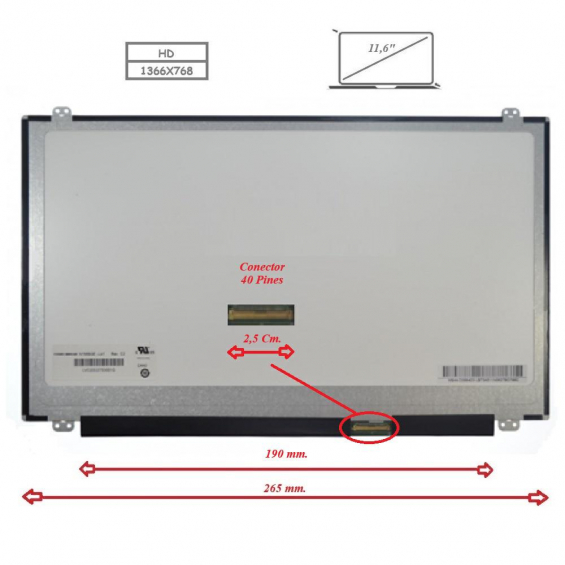 PANTALLA PORTATIL LED 11.6\" SLIM Características:Tamaño: 11.6 PulgadasResolución: WXGA 1366X768Conector: 40 pines Tecnología luz posterior: LED Compatible:B116XW03 V.0 N116BGE-L32 N116BGE-L42N116BGE-L41 B116XW03 V.2 N23B116XTN04.0 (revisar brackets)    Compruebe que corresponde la imagen con la pantalla que necesite.*** ATENCION ***Porfavor Asegúrese antes de instalar, montar, pegar, etc.. De NO quitar los protectores de plástico que lleva la pantalla. Antes tiene que Pre montarla y probar que la pantalla funciona correctamente ya que Todos Los Táctiles o pantalla LCD o LED deben probarse sobrepuestos. NO se aceptara NINGUN TIPO DE GARANTIA o DEVOLUCION una vez estén las protecciones retiradas, manipuladas o sin ellas.Una vez quitados los protectores se entenderá que la pantalla se ha instalado en el dispositivo y a partir de ese momento no se podrán reclamar daños o defectos. El fabricante solo acepta garantía de la pantalla sin haber sido instalada, debido a que, por su fragilidad durante la instalación se puede romper. Normalmente en el 95% de los casos es por incompatibilidad de la misma , no porque no funcione correctamente.