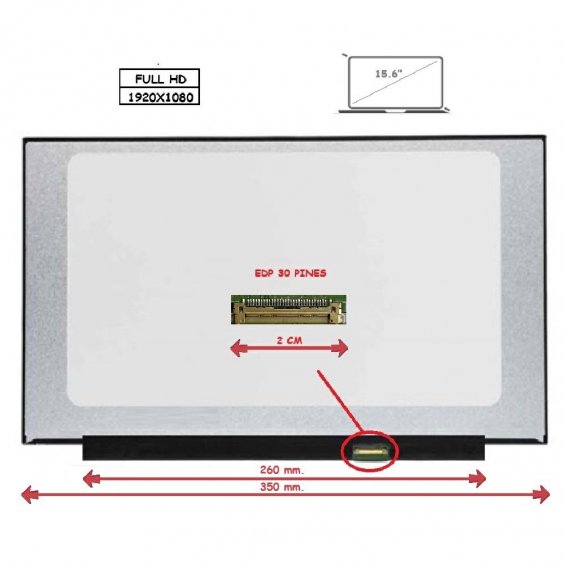 Pantalla para portátil LED 15.6 Slim 30 Pines Full HD Sin Brackets Ancho 350mm Inverter 260mm