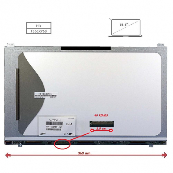 ¡¡¡ INFORMACIÓN IMPORTANTE ANTES DE ADQUIRIR EL PRODUCTO!!! Compruebe que la imagen corresponde con la pantalla que necesita. Asegúrese de la posición del conector, tamaño del conector, presencia o no de Brackets, etc.  Características:Tamaño: 15.6 PulgadasResolución: WXGA 1366X768 HDConector: 40 pines Tecnología luz posterior: LED Compatible:LTN156AT19-001LTN156AT19-501LTN156AT19-T01LTN156AT19LTN156AT19-W01LTN156AT18LTN156AT18-801LTN156AT18-C01N156BGE-L61N156BGE-L52N156BGE-L62LTN156AT19-503G33C0006K310BA59-03157ALTN156AT19-F01LTN156AT19-C01BA59-02879AP000542430P000557370P000560510P000540890P000563140LTN156AT19-001LJ96-05466C ¡¡¡ INFORMACIÓN IMPORTANTE SOBRE GARANTÍAS !!!Compruebe antes de instalar la pantalla y de quitar los protectores que la pantalla funciona correctamente. Siempre hay que comprobar el funcionamiento antes de Instalar la pantalla. Una vez retirado el protector y/o que la pantalla presente signos de haber sido montada (restos de adhesivo, arañazos en marco, etc) podrá ser invalidada su garantía ya que por una mala manipulación en la instalación, puede haberse dañado. En caso de pedir la pantalla por error y solicitar una devolución dentro del periodo ofrecido por nuestra empresa (excepto en productos bajo pedido), no se aceptará dicha devolución si la pantalla presenta signos de manipulación o se le han retirado las protecciones incluidas cuando se ha adquirido.