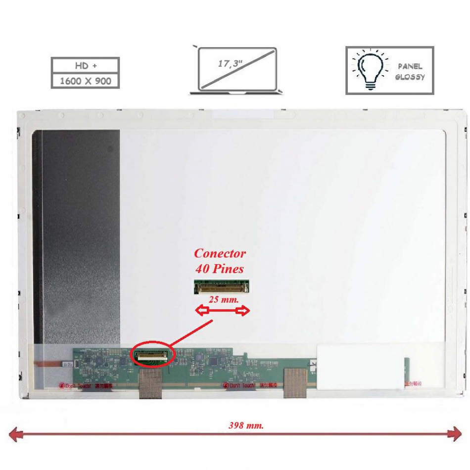 PANTALLA PORTATIL LED 17.3\"  Características:Tamaño: 17.3 PulgadasResolución: WXGA+ 1600X900Conector: 40 pines Tecnología luz posterior: LED Compatible:B173RW01B173RW01 V.3B173RW01 V0 B173RW01 V3 B173RW01 V.4B173RW01-V0-1AN17306-L02N17306-L02 REV CN17306-L02 REV C1N173O6-L02N173FGE-L23CLAA173UA01CLAA173UA01ACLAA173UAO1ALP173WD1LP173WD1(TL)(A1)LP173WD1(TL)(A2)LP173WD1(TL)(A3)LP173WD1(TL)(B2)LP173WD1-TLA2LTN173KT01LTN173KT01-C01LTN173KT02-801 LTN173KT03 N173FGE-L13 Compruebe que corresponde la imagen con la pantalla que necesite.*** ATENCION ***Porfavor Asegúrese antes de instalar, montar, pegar, etc.. De NO quitar los protectores de plástico que lleva la pantalla. Antes tiene que Pre montarla y probar que la pantalla funciona correctamente ya que Todos Los Táctiles o pantalla LCD o LED deben probarse sobrepuestos. NO se aceptara NINGUN TIPO DE GARANTIA o DEVOLUCION una vez estén las protecciones retiradas, manipuladas o sin ellas.Una vez quitados los protectores se entenderá que la pantalla se ha instalado en el dispositivo y a partir de ese momento no se podrán reclamar daños o defectos. El fabricante solo acepta garantía de la pantalla sin haber sido instalada, debido a que, por su fragilidad durante la instalación se puede romper. Normalmente en el 95% de los casos es por incompatibilidad de la misma , no porque no funcione correctamente.