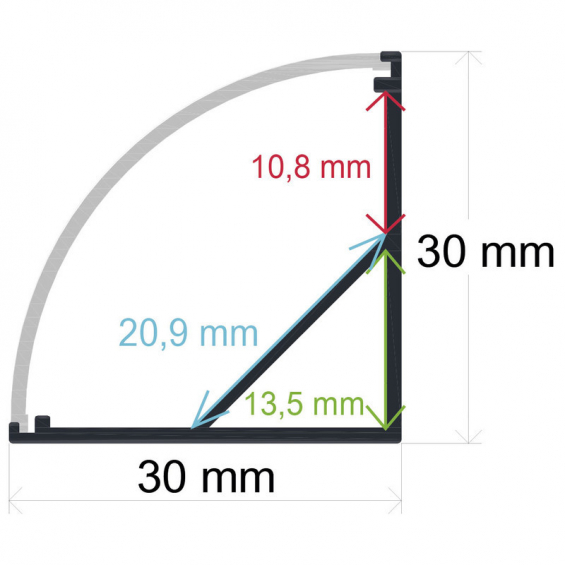 Barra de perfil LED de 30 mm. x 30 mm. de esquina con el difusor curvo.