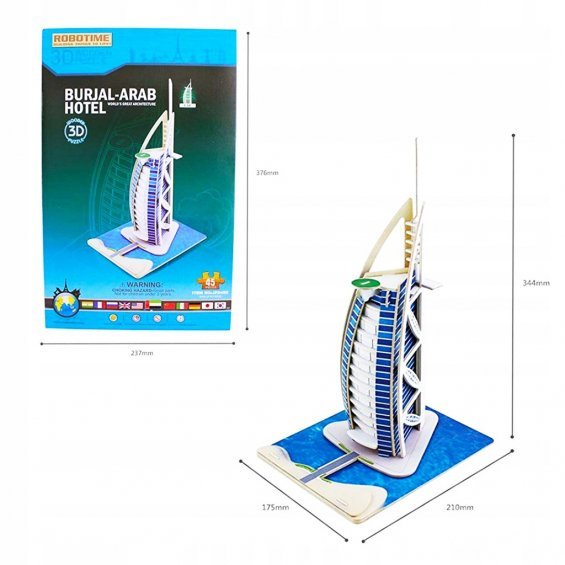 Este puzzle de madera es ideal tanto para adultos como para adolescentes, proporcionando horas de entretenimiento mientras se exploran las formas y detalles de este lujoso hotel de 7 estrellas. Con medidas de 175 x 210 x 344 mm una vez completado, el modelo es una pieza decorativa increíble para cualquier espacio. Además, su peso de 776 gr lo hace fácil de manejar y montar.