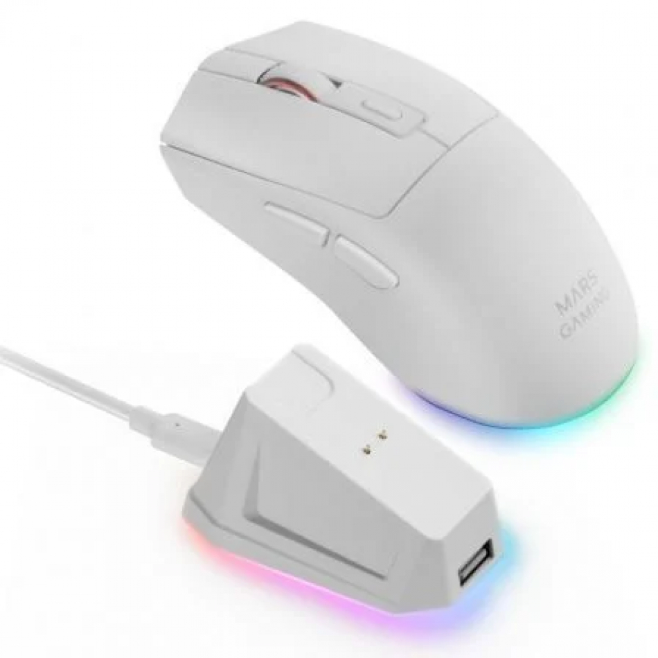 El MM-T3 incluye una base de carga con fijación magnética e iluminación RGB Chroma, que añade estilo a tu escritorio y mantiene tu ratón siempre listo para la acción. Gracias a su batería recargable de larga duración, disfrutarás de hasta 100 horas de uso (RGB OFF). Además, incorpora un puerto USB adicional para conectar dispositivos cómodamente.