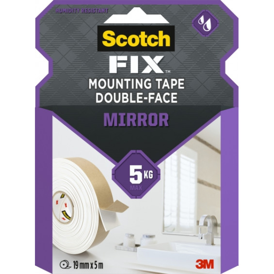 Scotch-FIX™ Cinta de montaje de espejos. Esta cinta diseñada para usarse en entornos húmedos interiores y es ideal para espejos, cerámica, azulejos, madera pulida, metal, vidrio y paredes pintadas. La cinta de montaje de espejos de doble cara Scotch-FIX™ es ideal para montar espejos y otros elementos en zonas interiores húmedas de forma permanente. Esta cinta de espuma de doble cara adaptable proporciona una unión rápida y permanente en superficies de interior y de exterior, incluidas paredes pintadas, metal, azulejos, cerámica y la mayoría de los plásticos. Su unión fuerte puede sostener sin clavos ni martillo gracias al adhesivo industrial de 3M™ de calidad superior. Esta cinta es resistente a la humedad, lo que la hace ideal para el montaje discreto de espejos (incluidas baldosas de espejo con reverso metálico y sin marco) y otros objetos en zonas de interior húmedas como baños y cocinas. Instrucciones de aplicación: 1. Limpia la superficie con alcohol y deja secar. 2. Aplica la cinta como se muestra en la imagen. 3. Presiona firmemente durante 60 segundos. PRECAUCIÓN: No colgar en zonas donde se pueden producir lesiones si el objeto colgado llega a caer. Este producto tiene un adhesivo permanente y puede provocar daños si se retira. CONSEJOS DE USO: No lo utilice en paredes con papel pintado ni en superficies delicadas. Asegúrate de que la superficie sea plana y lisa y que pueda soportar un objeto colgado. Toda la superficie de la cinta debe adherirse por completo a ambos lados. Temperatura de aplicación: 10° C -37° C. Aspectos destacados -PARA USO EN INTERIORES EN ENTORNOS HÚMEDOS: Esta cinta de espuma de doble cara muy adaptable es ideal para montaje en entornos húmedos de espejos y otros elementos sobre cerámica, azulejos, madera pulida, metal, vidrio y paredes pintadas -CAPACIDAD DE CARGA DE HASTA 5 KG: Esta cinta de montaje de doble cara puede soportar hasta 5 kg (1 kg/20 cm). Es resistente a la humedad, ideal para montar espejos, azulejos, accesorios de baño y otros artículos en áreas interiores húmedas como baños y cocinas -RESISTENCIA TÉRMICA: La cinta de montaje para espejos en interiores Scotch-FIX™ resiste temperaturas que oscilan entre 0 °C y 70 °C -ADHESIVO: Adhesivo de espuma de doble capa de primera calidad diseñado para fijar de forma permanente artículos pequeños y medianos a la mayoría de las superficies en zonas húmedas -FÁCIL DE USAR: No se necesitan herramientas ni taladros para la aplicación de esta cinta de montaje de doble cara 3M. Ideal para soluciones de montaje rápidas y sencillas -GUÍA DE APLICACIÓN: Comprobar que la superficie sea plana y lisa y que pueda soportar objetos colgados. Toda la superficie de la cinta debe adherirse por completo a ambos lados. Temperatura de aplicación de 10 °C a 37 °C. Limpiar la superficie con alcohol y dejar secar. Aplicar la cinta. Presionar firmemente durante 60 segundos -ADVERTENCIA: No colgar en zonas donde se pueden producir lesiones si el objeto colgado llegara a caer. Este producto tiene un adhesivo permanente y puede provocar daños si se retira. No utilizar en paredes con papel pintado ni en superficies delicadas Especificaciones: -Material: Espuma -Tipo de cinta: Doble cara -Adhesivo: Acrílico
