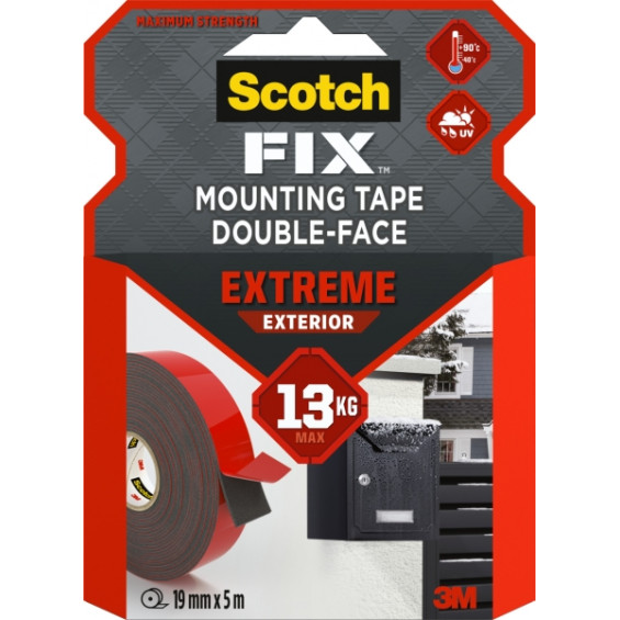 Scotch-FIX™ Cinta de montaje para exteriores Extreme con Tecnología avanzada de 3M™. Esta cinta superior permanente y adaptable está diseñada para su uso extremo en exteriores y es ideal para paredes pintadas, madera pintada o pulida, metal, acrílico, piedra lisa y hormigón pintado. Para los trabajos de exterior más difíciles, elija la cinta de montaje de doble cara para exteriores Extreme Scotch-FIX™ más resistente con Tecnología avanzada de 3M™. Esta cinta de doble cara, equipada con un potente adhesivo permanente. Es resistente a las condiciones climáticas para una unión duradera en exteriores. Tanto si quiere fijar un buzón en su nueva casa como si quiere organizar las paredes del garaje, la cinta de montaje de doble cara para exteriores Extreme Scotch-FIX™ hace el trabajo de forma rápida, sencilla y sin herramientas. Instrucciones de aplicación: 1. Limpia la superficie con alcohol y deja secar. 2. Aplica la cinta como se muestra en la imagen. 3. Presiona firmemente durante 60 segundos. PRECAUCIÓN: No colgar en zonas donde se pueden producir lesiones si el objeto colgado llega a caer. Este producto tiene un adhesivo permanente y puede provocar daños si se retira. CONSEJOS DE USO: No lo utilice en paredes con papel pintado ni en superficies delicadas. Asegúrate de que la superficie sea plana y lisa y que pueda soportar un objeto colgado. Toda la superficie de la cinta debe adherirse por completo a ambos lados. Temperatura de aplicación: 10° C -40° C. Aspectos destacados -RENDIMIENTO DE ADHERENCIA MUY ALTO: La cinta de montaje más resistente de la gama proporciona una unión permanente y superior diseñada para uso extremo en exteriores. Es ideal para paredes pintadas, madera pintada/pulida, metal, acrílico, piedra lisa y hormigón pintado -CAPACIDAD DE CARGA DE HASTA 13 KG: Esta cinta adhesiva de doble cara puede soportar hasta 13 kg (1 kg/15 cm), lo que la hace ideal para aplicaciones intensivas en exteriores. Adecuada para montar buzones, decoración de exteriores, macetas y mucho más -RESISTENTE A LA INTEMPERIE: Diseñada para soportar condiciones climáticas adversas, esta duradera cinta de doble cara sigue siendo eficaz en temperaturas extremas que van desde –40 °C a 90 °C, lo que garantiza la durabilidad en cualquier clima. Ideal para reparaciones y montajes en exteriores -TECNOLOGÍA 3M: Con un 100 % de adhesivo con tecnología 3M, esta cinta de doble cara proporciona una sujeción fiable y duradera. Ideal para soluciones de montaje rápidas y sencillas -FÁCIL DE USAR: No se necesitan herramientas ni taladros para la aplicación de esta cinta de montaje de doble cara 3M. Ideal para soluciones de montaje rápidas y sencillas -GUÍA DE APLICACIÓN: Comprobar que la superficie sea plana y lisa y que pueda soportar objetos colgados. Toda la superficie de la cinta debe adherirse por completo a ambos lados. Temperatura de aplicación de 10 °C a 40 °C. Limpiar la superficie con alcohol y dejar secar. Aplicar la cinta. Presionar firmemente durante 60 segundos -ADVERTENCIA: No colgar en zonas donde se pueden producir lesiones si el objeto colgado llegara a caer. Tiene un adhesivo permanente y puede provocar daños si se retira. No usar en papel o superficies curvadas Especificaciones: -Material: Espuma -Tipo de cinta: Doble cara -Adhesivo: Acrílico