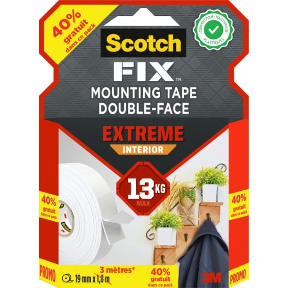 Scotch-FIX™ Cinta de montaje en interiores Extreme con Tecnología avanzada de 3M™. Esta cinta permanente, adaptable y de calidad superior, está diseñada para un uso extremo en interiores y es la única cinta de montaje que funciona en plásticos, incluidos plásticos duros como PP y PE, por lo que también es ideal para metales, superficies lisas y pintadas y madera. Para los trabajos de interior más difíciles, elija la cinta de montaje de doble cara para interiores Extreme Scotch-FIX™ más resistente con Tecnología avanzada de 3M™. Esta cinta de doble cara, equipada con un potente adhesivo permanente. Funciona en la mayoría de las superficies interiores, incluso en el caso de plásticos duros como PP y PE. Tanto si quiere montar un perchero en su nueva casa como si quiere organizar las paredes del sótano, la cinta de montaje de doble cara para interiores Extreme Scotch-FIX™ hace el trabajo de forma rápida, sencilla y sin herramientas. Instrucciones de aplicación: 1. Limpia la superficie con alcohol y deja secar. 2. Aplica la cinta como se muestra en la imagen. 3. Presiona firmemente durante 60 segundos. PRECAUCIÓN: No colgar en zonas donde se pueden producir lesiones si el objeto colgado llega a caer. Este producto tiene un adhesivo permanente y puede provocar daños si se retira. CONSEJOS DE USO: No lo utilice en paredes con papel pintado ni en superficies delicadas. Asegúrate de que la superficie sea plana y lisa y que pueda soportar un objeto colgado. Toda la superficie de la cinta debe adherirse por completo a ambos lados. Temperatura de aplicación: 10° C -40° C. Aspectos destacados -RENDIMIENTO DE ADHERENCIA MUY ALTO: La cinta de montaje más resistente de la gama ofrece una unión superior y permanente diseñada para uso extremo en interiores. Es la única cinta de montaje que funciona en plásticos, incluidos plásticos duros como PP y PE. También es ideal sobre metal, superficies pintadas y madera -CAPACIDAD DE CARGA DE HASTA 13 KG: Esta cinta adhesiva de doble cara puede soportar hasta 13 kg (1 kg/15 cm), lo que la hace ideal para aplicaciones intensivas en interiores. Adecuada para reparación o montaje, como percheros, estantes, soportes de herramientas y todo tipo de objetos o recipientes de plástico -RESISTENTE A LA INTEMPERIE: Diseñada para soportar condiciones climáticas adversas, esta duradera cinta de doble cara sigue siendo eficaz en temperaturas extremas que van desde –20 °C a 80 °C, lo que garantiza la durabilidad en cualquier clima. Ideal para reparaciones y montajes en interiores -TECNOLOGÍA 3M: Con un 100 % de adhesivo con tecnología 3M, esta cinta de doble cara proporciona una sujeción fiable y duradera. Ideal para soluciones de montaje rápidas y sencillas -FÁCIL DE USAR: No se necesitan herramientas ni taladros para la aplicación de esta cinta de montaje de doble cara 3M. Ideal para soluciones de montaje rápidas y sencillas -GUÍA DE APLICACIÓN: Comprobar que la superficie sea plana y lisa y que pueda soportar objetos colgados. Toda la superficie de la cinta debe adherirse por completo a ambos lados. Temperatura de aplicación de 10 °C a 40 °C. Limpiar la superficie con alcohol y dejar secar. Aplicar la cinta. Presionar firmemente durante 60 segundos -ADVERTENCIA: No colgar en zonas donde se pueden producir lesiones si el objeto colgado llegara a caer. Este producto tiene un adhesivo permanente y puede provocar daños si se retira. No utilizar en paredes con papel pintado ni en superficies delicadas Especificaciones: -Material: Espuma -Tipo de cinta: Doble cara -Adhesivo: Acrílico
