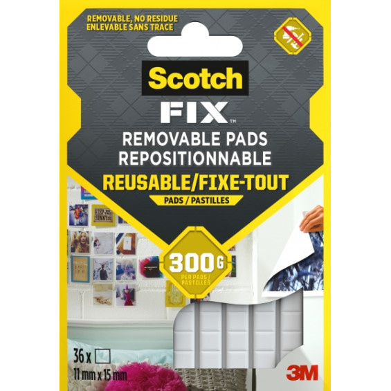 Las tiras adhesivas reutilizables Scotch-FIX™ son de masilla adaptables y no dejan residuos. Son ideales para montajes ligeros en superficies pintadas o empapeladas. Estas tiras adhesivas reutilizables, que pueden sostener hasta 300 g, se adhieren a una gran variedad de superficies porosas y no porosas. Cambia tu decoración con la mayor rapidez posible gracias a las tiras adhesivas reutilizables Scotch-FIX™. Ideales para tus pósteres, fotografías o material gráfico favoritos, se montan sin esfuerzo en una gran variedad de superficies, incluso en superficies curvas rugosas y pintadas. Las tiras de masilla adaptables se retiran fácilmente tanto del objeto como de la superficie y pueden volver a usarse una y otra vez. Las tiras adhesivas reutilizables Scotch-FIX™ permiten personalizar el tamaño del adhesivo y, además, estas almohadillas de masilla no dejan ningún residuo blanco ni amarillo en las superficies. No hay riesgo de marcas o daños en paredes pintadas o empapeladas. Aspectos destacados -DISEÑADAS PARA: Estas tiras reutilizables están diseñadas para uso en interiores. Se adhieren a diversas superficies porosas y no porosas y son ideales para un montaje ligero sobre superficies pintadas o empapeladas -CAPACIDAD DE CARGA DE HASTA 300 g: Estas tiras de montaje pueden soportar hasta 300 g por almohadilla, lo que las hace ideales para montajes ligeros en interiores y fijación temporal de papeles, fotos, carteles, tarjetas y más -SIN DAÑAR: Estas tiras adhesivas reutilizables no dejan residuos en ninguna superficie cuando se retiran. No hay riesgo de marcas o daños en paredes pintadas o empapeladas -ADHESIVO: Tiras adhesivas de masilla suaves y adaptables para montar carteles o pequeños objetos en superficies uniformes o estampadas -FÁCIL DE USAR: No se necesitan herramientas para la aplicación de estas almohadillas adhesivas reutilizables de doble cara. Para garantizar una unión óptima, asegúrate de que la superficie sea lisa y esté limpia y seca. Solo tienes que limpiar la superficie, aplicar la cinta y presionar firmemente durante 60 segundos. Ideal para un montaje rápido y sencillo y una retirada limpia Especificaciones: -Material: Lámina de polietileno -Tipo de cinta: Doble cara -Adhesivo: Caucho