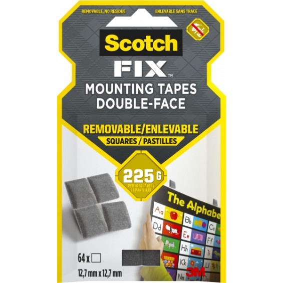 Las tiras adhesivas reutilizables Scotch-FIX™ son de masilla adaptables y no dejan residuos. Son ideales para montajes ligeros en superficies pintadas o empapeladas. Estas tiras adhesivas reutilizables, que pueden sostener hasta 300 g, se adhieren a una gran variedad de superficies porosas y no porosas. Cambia tu decoración con la mayor rapidez posible gracias a las tiras adhesivas reutilizables Scotch-FIX™. Ideales para tus pósteres, fotografías o material gráfico favoritos, se montan sin esfuerzo en una gran variedad de superficies, incluso en superficies curvas rugosas y pintadas. Las tiras de masilla adaptables se retiran fácilmente tanto del objeto como de la superficie y pueden volver a usarse una y otra vez. Las tiras adhesivas reutilizables Scotch-FIX™ permiten personalizar el tamaño del adhesivo y, además, estas almohadillas de masilla no dejan ningún residuo blanco ni amarillo en las superficies. No hay riesgo de marcas o daños en paredes pintadas o empapeladas. Aspectos destacados -DISEÑADAS PARA: Estas tiras reutilizables están diseñadas para uso en interiores. Se adhieren a diversas superficies porosas y no porosas y son ideales para un montaje ligero sobre superficies pintadas o empapeladas -CAPACIDAD DE CARGA DE HASTA 225 g: Estas tiras de montaje pueden soportar hasta 225 g por almohadilla, lo que las hace ideales para montajes ligeros en interiores y fijación temporal de papeles, fotos, carteles, tarjetas y más -SIN DAÑAR: Estas tiras adhesivas reutilizables no dejan residuos en ninguna superficie cuando se retiran. No hay riesgo de marcas o daños en paredes pintadas o empapeladas -ADHESIVO: Tiras adhesivas de masilla suaves y adaptables para montar carteles o pequeños objetos en superficies uniformes o estampadas -FÁCIL DE USAR: No se necesitan herramientas para la aplicación de estas almohadillas adhesivas reutilizables de doble cara. Para garantizar una unión óptima, asegúrate de que la superficie sea lisa y esté limpia y seca. Solo tienes que limpiar la superficie, aplicar la cinta y presionar firmemente durante 60 segundos. Ideal para un montaje rápido y sencillo y una retirada limpia Especificaciones: -Material: Espuma -Tipo de cinta: Doble cara -Adhesivo: Acrílico