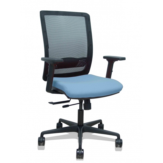 PIQUERAS Y CRESPO Modelo Haches - Silla de oficina ergonómica con mecanismo sincro con traslack, brazos regulables en 2D y ajustable en altura - Respaldo de malla transpirable en color negro con refuerzo lumbar regulable y asiento tapizados en tejido BALI color azul cielo. Ruedas de nailon de 65mm.