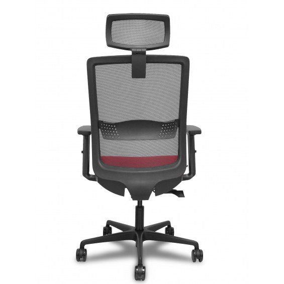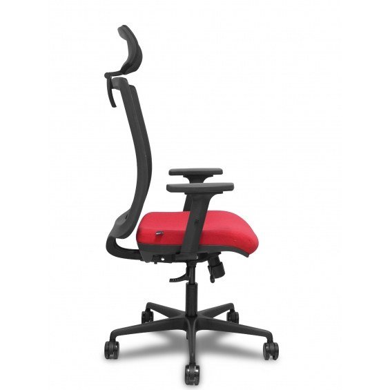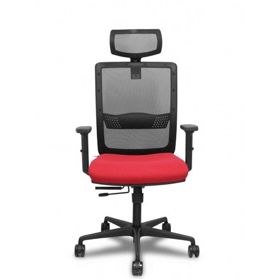PIQUERAS Y CRESPO Modelo Haches - Silla de oficina ergonómica con mecanismo sincro con traslack, brazos regulables en 2D y ajustable en altura - Respaldo de malla transpirable en color negro con refuerzo lumbar regulable, cabecero regulable de malla y asiento tapizados en tejido BALI color rojo. Ruedas de nailon de 65mm.