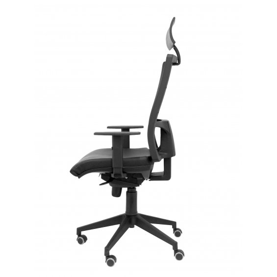 PIQUERAS Y CRESPO Modelo Horna Silla de oficina ergonómica con mecanismo sincro y regulable en altura Respaldo alto de malla transpirable con cabecero y asiento tapizado en piel color negro (CON CABECERO INCLUIDO)