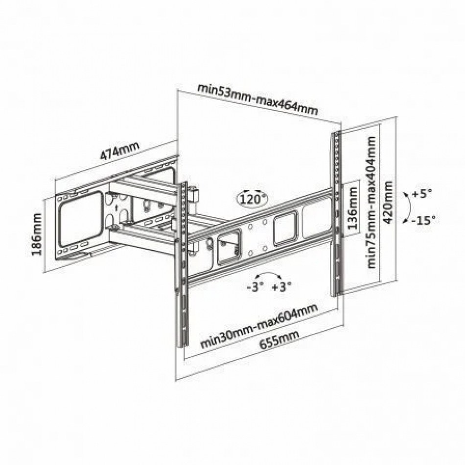 • Distancia de la pared: ajustable entre 53 y 464 mm. Sistema de gestión de cables: dispone de unos ganchos para poder agrupar los cables. Manual de instrucciones multi idiomas