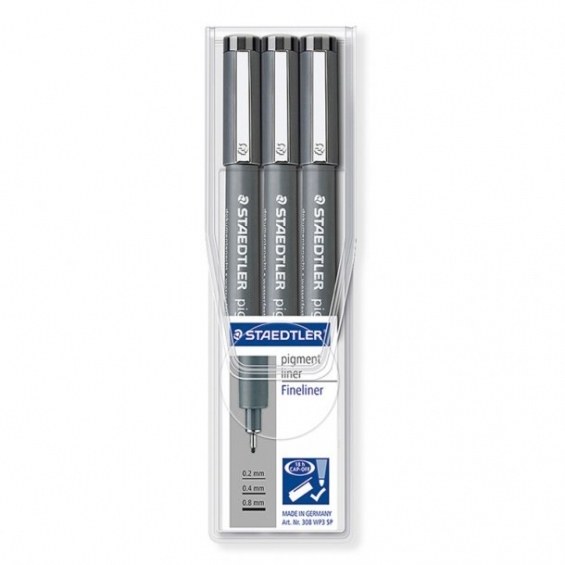 Estuche de plástico con 3 rotuladores (0,2; 0,4; 0,8 mm).Rotulador calibrado para escribir, esbozar y dibujar con punta engarzada en metal, ideal para usar con reglas y plantillas, tinta pigmentada indeleble de secado rápido, resistente al agua y a la luz, clip metálico, cuerpo de polipropileno (PP), escritura en color negro.Características:-Punta larga de metal para dibujar, escribir y esbozar Perfecta para usar con plantillas y reglas Anchos variados de 0,2 mm, 0,4 mm y 0,8 mm.-Tinta negra pigmentada, indeleble (según la norma ISO 14145-2), resistente a la luminosidad y al agua Deleble sobre papel vegetal.-Tecnología airplane safe, que equilibra automáticamente la presión de la tinta para evitar pérdidas durante el vuelo.-CAP OFF: puede permanecer durante 18 horas destapado sin secarse ( ISO 554) El cuerpo en PP garantiza una larga vida del producto.-Paquete de 3 marcadores negros de punta fina presentados en un estuche de plástico transparente Staedtler Box, ideal para un almacenamiento eficiente.