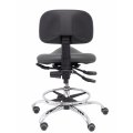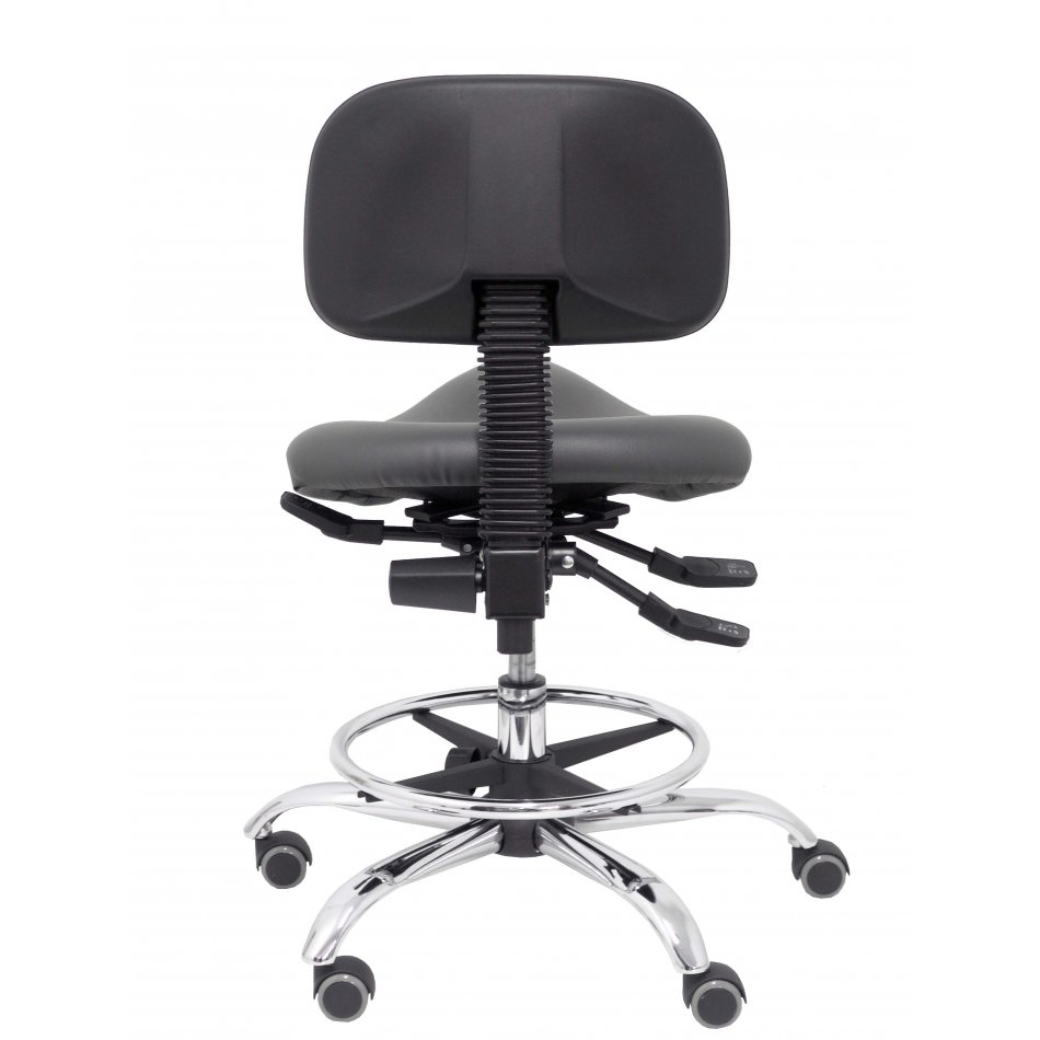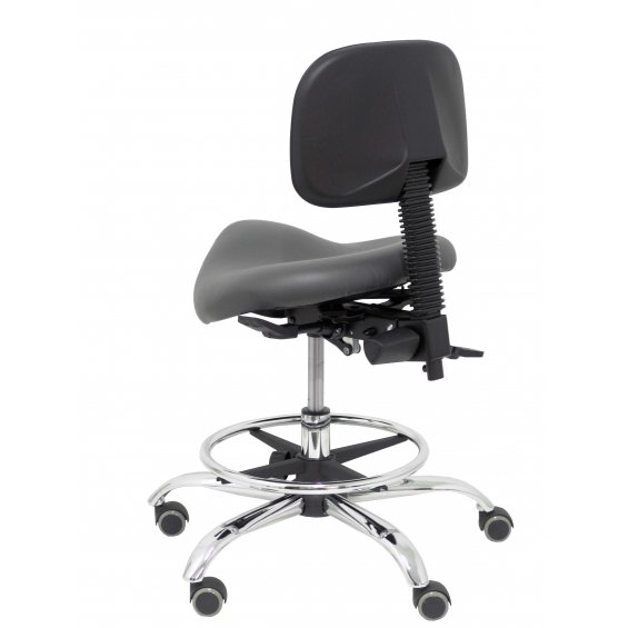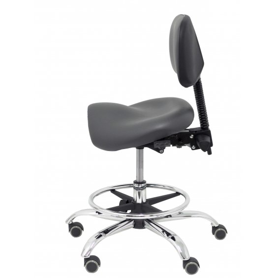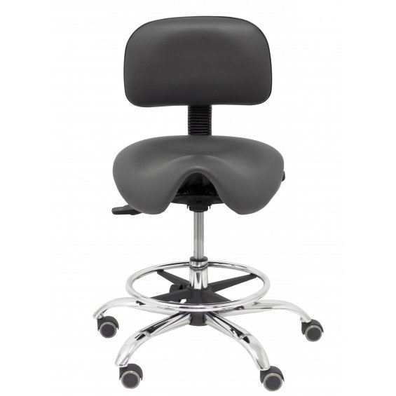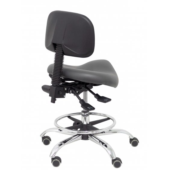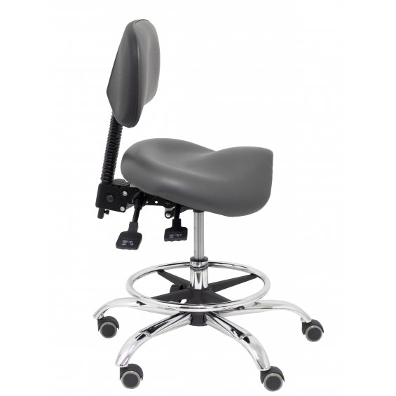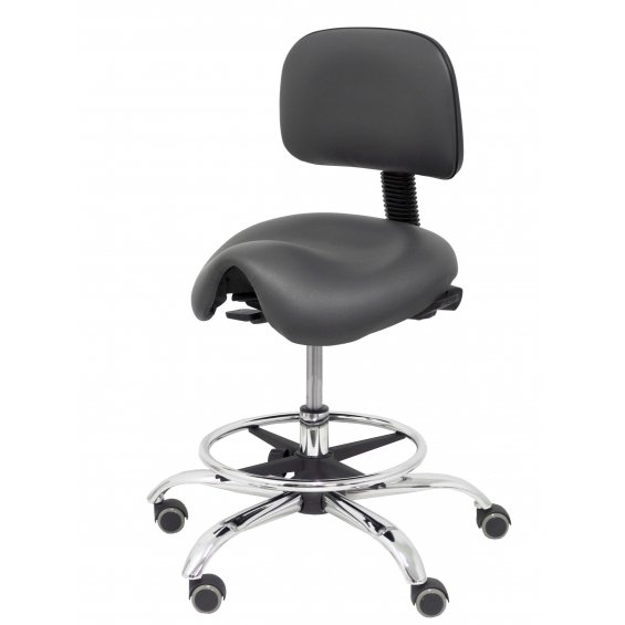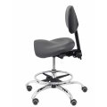 PIQUERAS Y CRESPO Modelo Zarza -Taburete clínico ergonómico con mecanismo asincro, regulable en altura y ruedas de parqué - Base cromada. Aro reposapiés regulable y cromado. Asiento y respaldo tapizados en tejido similpiel color gris oscuro.