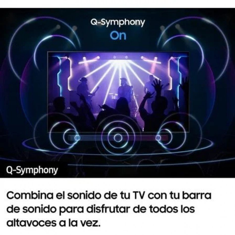 TV y Barra de sonido, sincronizdos en perfecta armonía Disfruta de todos los altavoces a la vez. Esta tecnología exclusiva de Samsung combina el sonido de tu TV con tu barra de sonido, sin anular ninguno, creando una atmósfera envolvente a tu alrededor