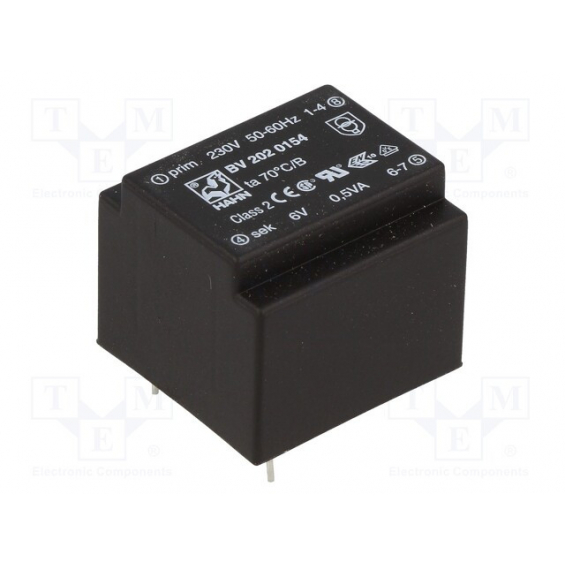 Transformador Cerrado 0,5VA 230VCA salida 6Vac 83mA Cto.Impreso